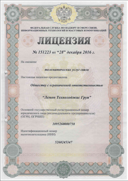 Получение этой лицензии означает, что услуги и организационная структура “Лемон Технолоджис Груп” соответствуют государственным стандартам качества по оказанию услуг связи, вся деятельность компании осуществляется в рамках правового поля Российской Федерации. Персональные данные клиентов надежно защищены.