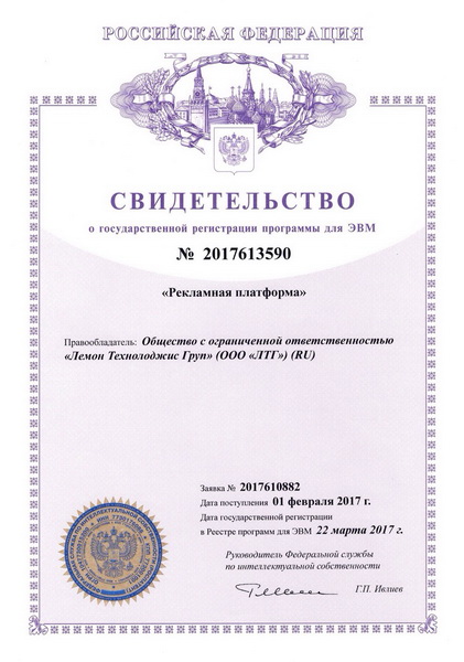 Группа компаний «Лемон Технолоджис Груп» получила патент №2017613590 «Рекламная платформа».